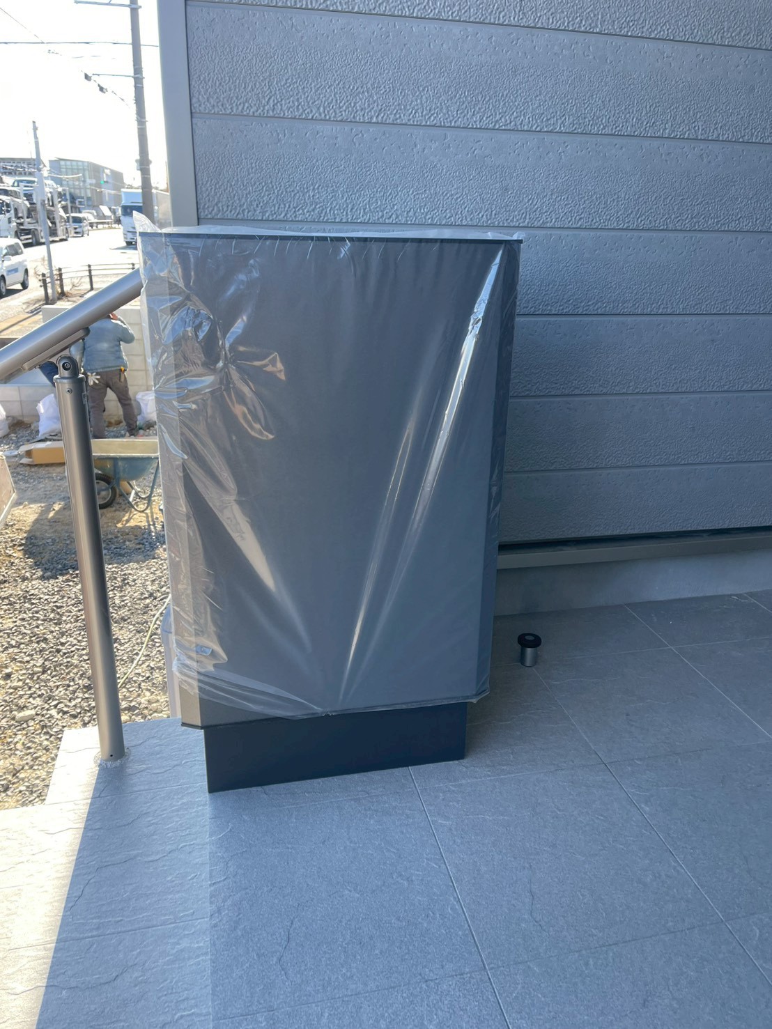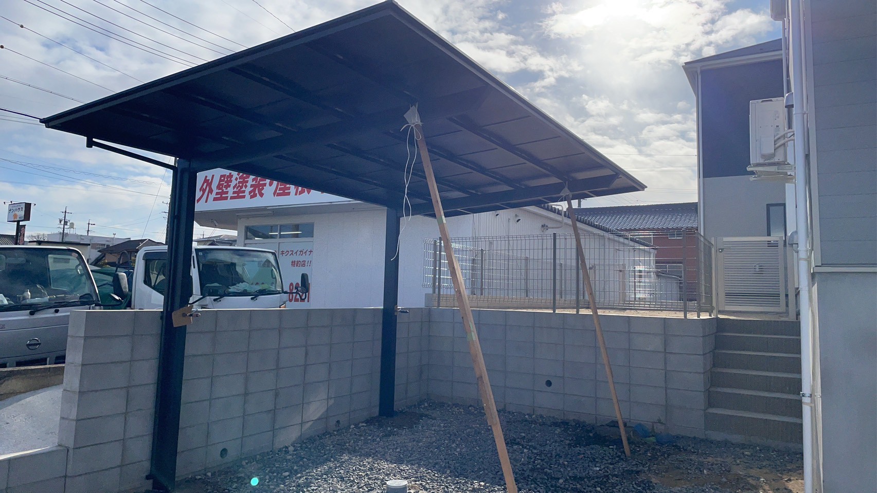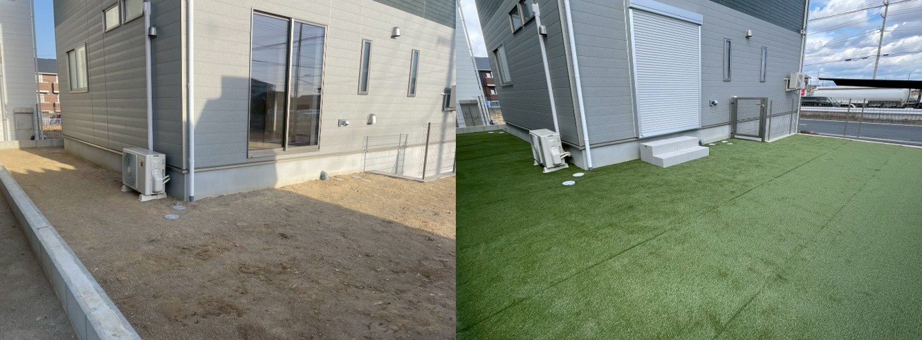 | ■お客様のご要望 ・駐車場側の土間打ち ・庭へ人工芝、フェンス、門扉、出入口ステップ ・要領大き目の宅配ボックス ・カーポート1台用 ・物置設置 ・階段へノンスリップ取付 ■施工内容詳細 新築購入後、外構周りを一通り変えたいとのご要望で施工させていただきました。 まずはお庭側🌸 お庭が砂地&囲いがなくオープンの為、フェンスで囲ったのちに人工芝、庭への出入り口に収納付きステップを設置。 お庭が鮮やかなグリーンに生まれ変わり、印象がガラリと変わりました✨ 出入口2ヶ所に門扉を付けることで、動線をしっかり確保しつつ安心して遊べるお庭となっています(*'ω'*) つぎは駐車場側🚙 柱があると駐車有効スペースが減るため、片足の1台カーポートを選ばれました✨ カーポートは最近人気上昇中、ブラックマットポリカ屋根になっています👀 こちらは屋根材が黒となっており、見た目がシックでかっこよく、光を通さない為車内温度を抑えてくれます(^^) 物置はイナバのフォルタ、こちらも大人気色のフランネルグレーです。 物がしっかり入るサイズかつ、建物の配管隠しにも一役買っていますね! 土工事は全面土間を打ちまして、利便性の向上&夏でも雑草に悩まされることのない駐車場に生まれ変わりました(*'ω'*) 玄関前も🌻 玄関前の階段にかなりの階段数があるので、すべての段にゴム付きノンスリップを取付しました! 安心して上り下りできる仕様になったのではないでしょうか✨ お客様の宅配ボックスのご希望条件は、ペットボトル24本入りが受け取れる、かつ玄関前に置ける物ことのこと。 ドアが宅配ボックスに干渉しないかなど、ドアを開けた寸法などしっかり計測し、商品を探しました! 今回はユニソンのヴィコがベストマッチ✨本当~~にギリギリサイズの物が見つかったので一安心でした(*_*) スマートフォンを使って解錠ができる新商品がちょうど発売されたタイミングだったので、ご提案したところ採用していただきました(^^♪ こちらのお客様はオプション追加で、ICカードや指紋でも開けられる仕様にしております。 ■おすすめポイント 建物がグレーを基調とした色合いに合わせて、エクステリア全般もグレー系で選ばれている為、 統一感あるおうちの顔が完成しました(*'ω'*) 利便性UPと雰囲気の変化が感じられるのが外構工事の魅力ですね☺ 建物などの物件購入後、ご入居前に合わせて工事をすることで、ご入居開始時から不便なく日常生活を送っていただくことができますよ(*'ω'*) 住みながらの工事も可能ですが、特に土間打ちは車の置き場所、毎日の家への出入りなど、どうしても普段の生活に支障がでてしまいがちです😿 もちろん、お住まい後の土間打ちの場合においては、動線などは確保しながら工事できるように進めていきますよ~👍 こうしたおうちの外構工事&エクステリア工事もお気軽にご相談ください✨ ■商品仕様 人工芝:グリーンフィールド リアリーターフ 毛足25mm ステップ:城東テクノ ハウスステップ CUB6040WS フェンス:LIXIL ハイグリッドフェンスUF-8型 H800 シャイングレー 門扉:LIXIL 開き門扉AB YR2型 0810 シャイングレー カーポート:LIXIL フーゴF1台用 30-54型 ロング柱 ブラックマットポリカ屋根 本体ブラック 物置:イナバ物置 フォルタFS-2209 フランネルグレー 宅配BOX:ユニソン ヴィコスマート DB120 ポストなし メタルグレー (オプション:セサミタッチ) | |||||