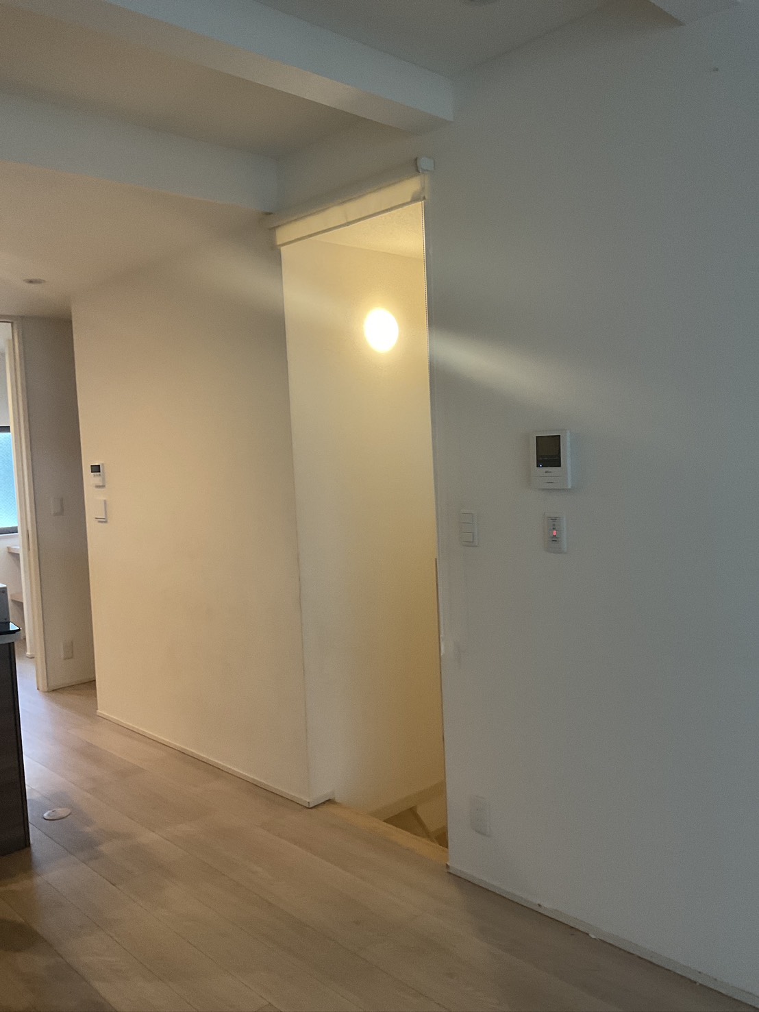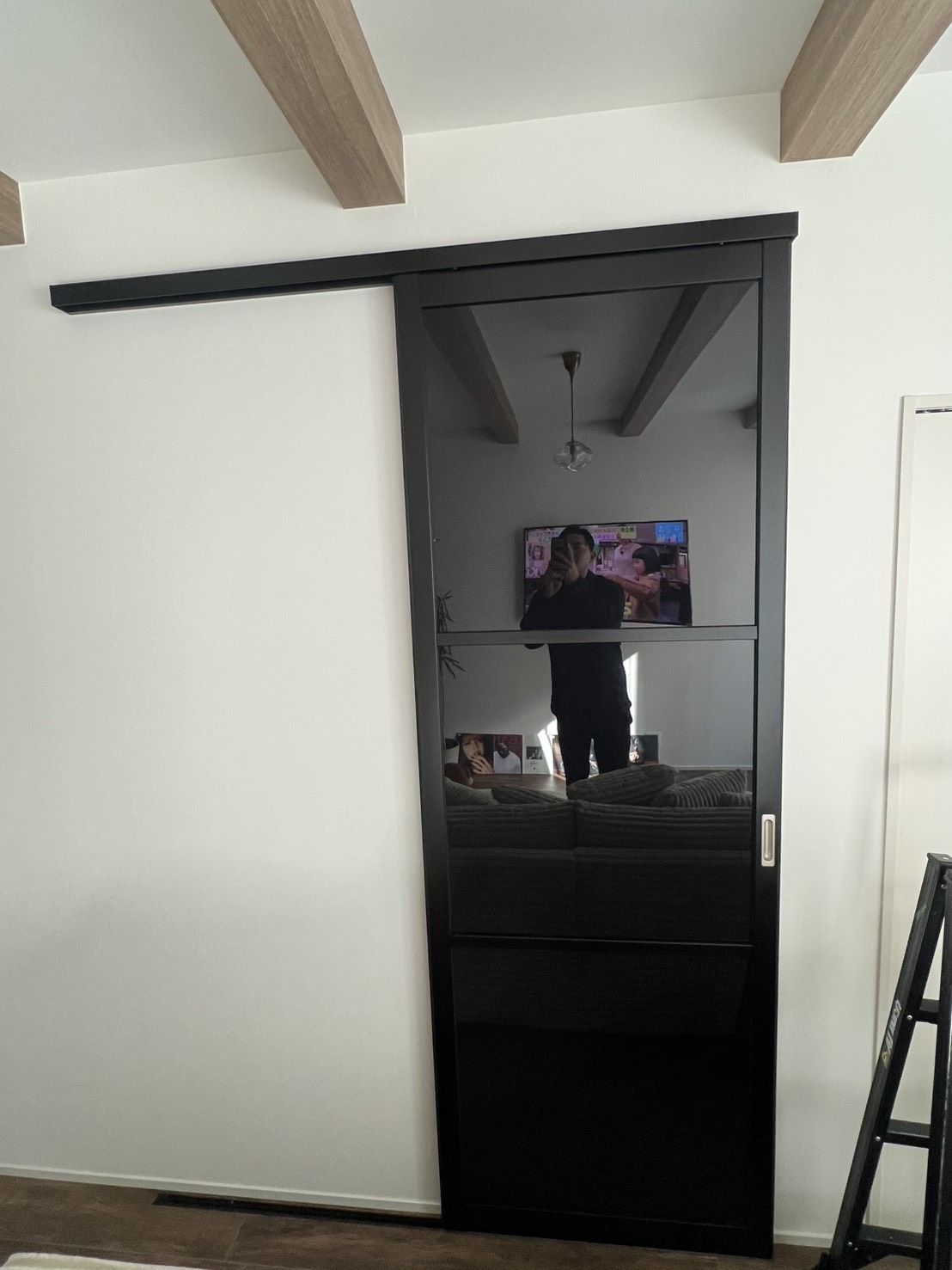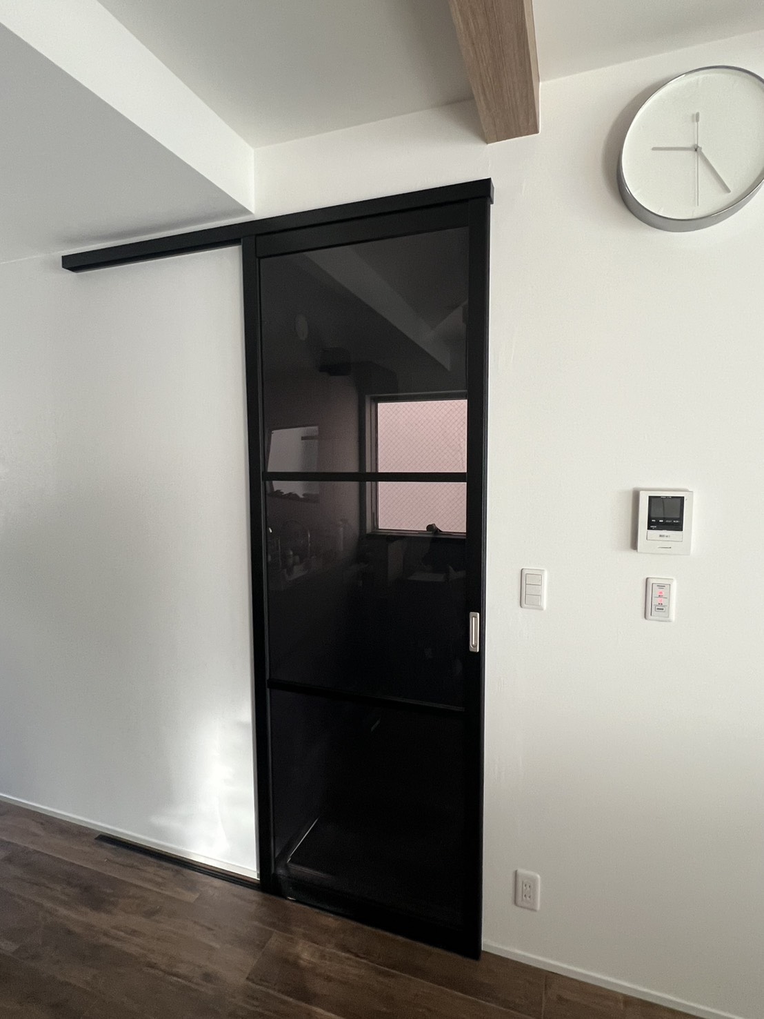 | ■お客様のご要望 階段とリビングの間を仕切りたい ■施工内容詳細 内装スライドドア新設 ドアレールの為の下地補強+クロス張替えの上でドアレールを設置しました。 ブラック×スモークのパネルがシックな印象ですね。 室内の雰囲気もこのドアだけでがらりと変わります✨ 開放的なリビング階段を仕切るだけで、音の遮断や冷暖房効率もアップなど色々メリットがありますよ(*'ω'*) ■商品仕様 タチカワブラインド プレイス引き戸フラット ガイドパネルD アウトセット納まり W775×H2400 フレームカラー:ブラック(PL807) 採光窓:スモーク | |||||