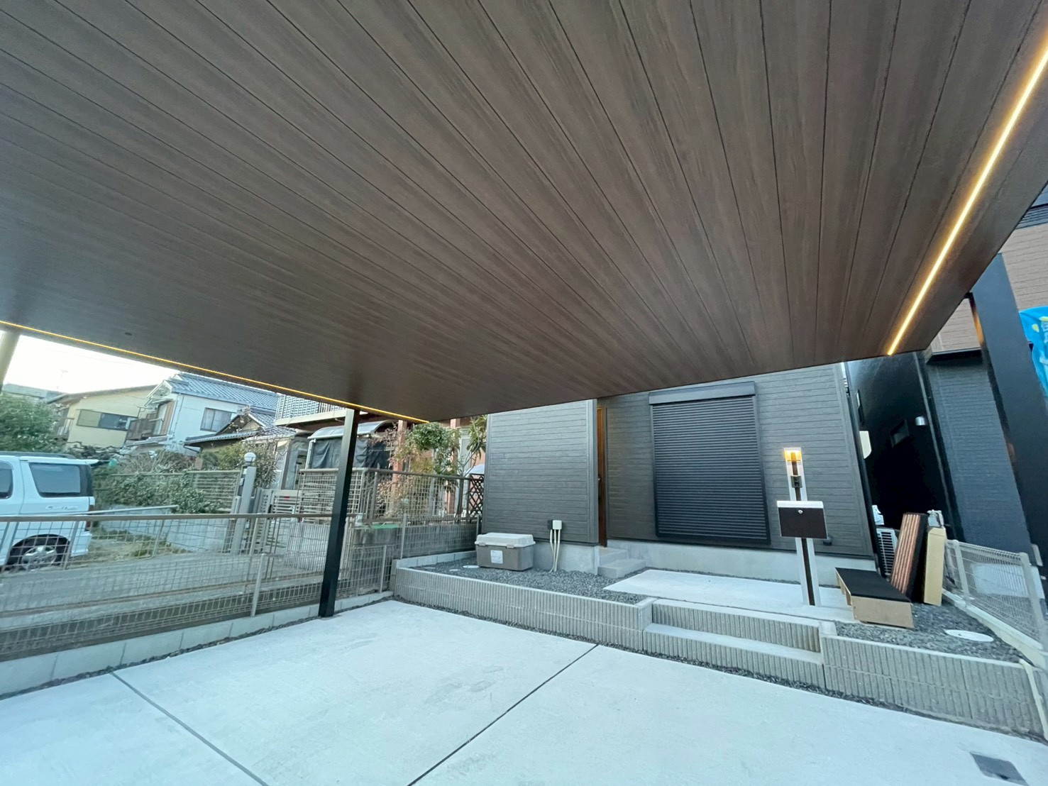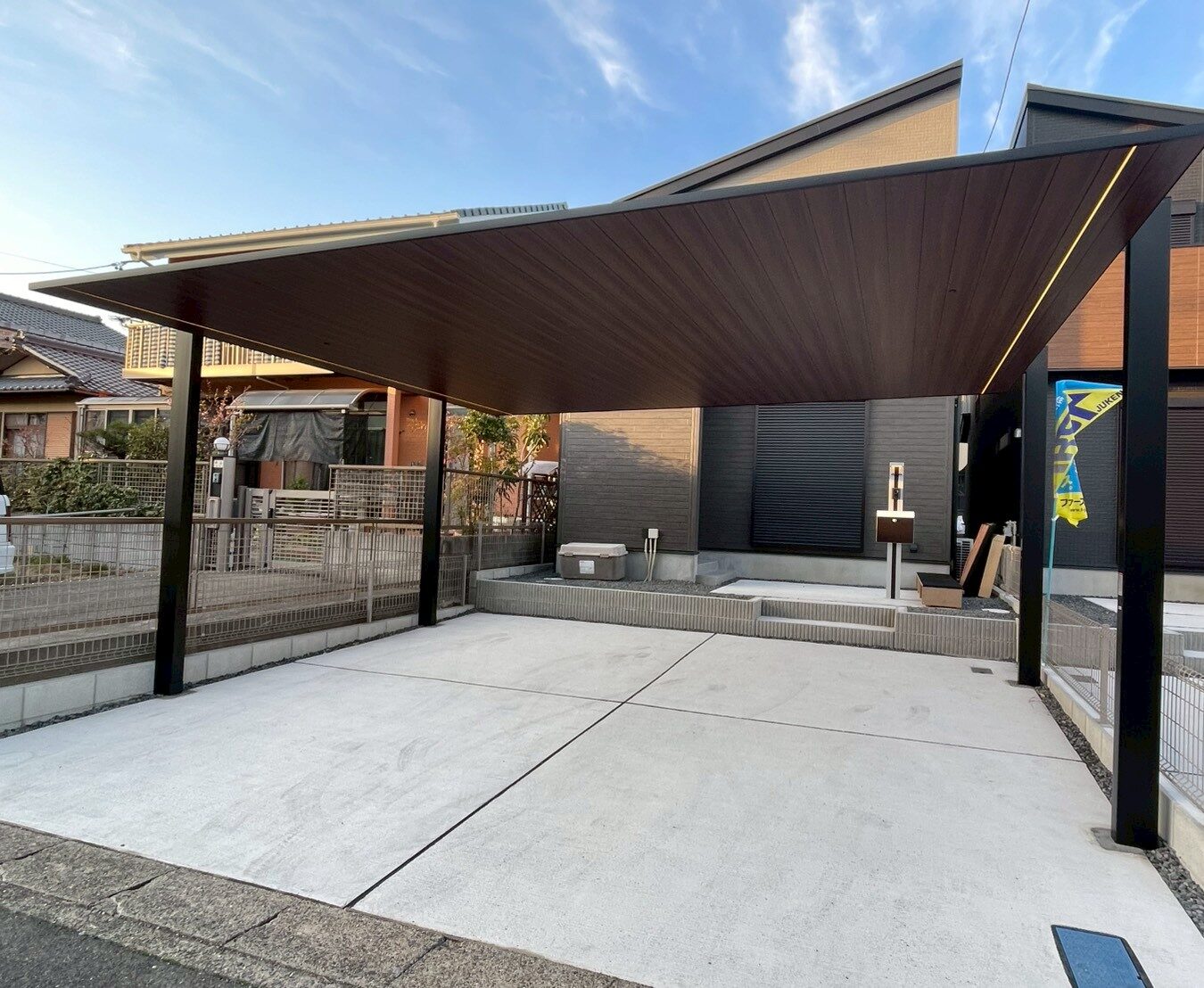 木調とブラック柱のツートンカラーの組み合わせが素敵で、デザイン性にも機能性にも優れたカーポートです。